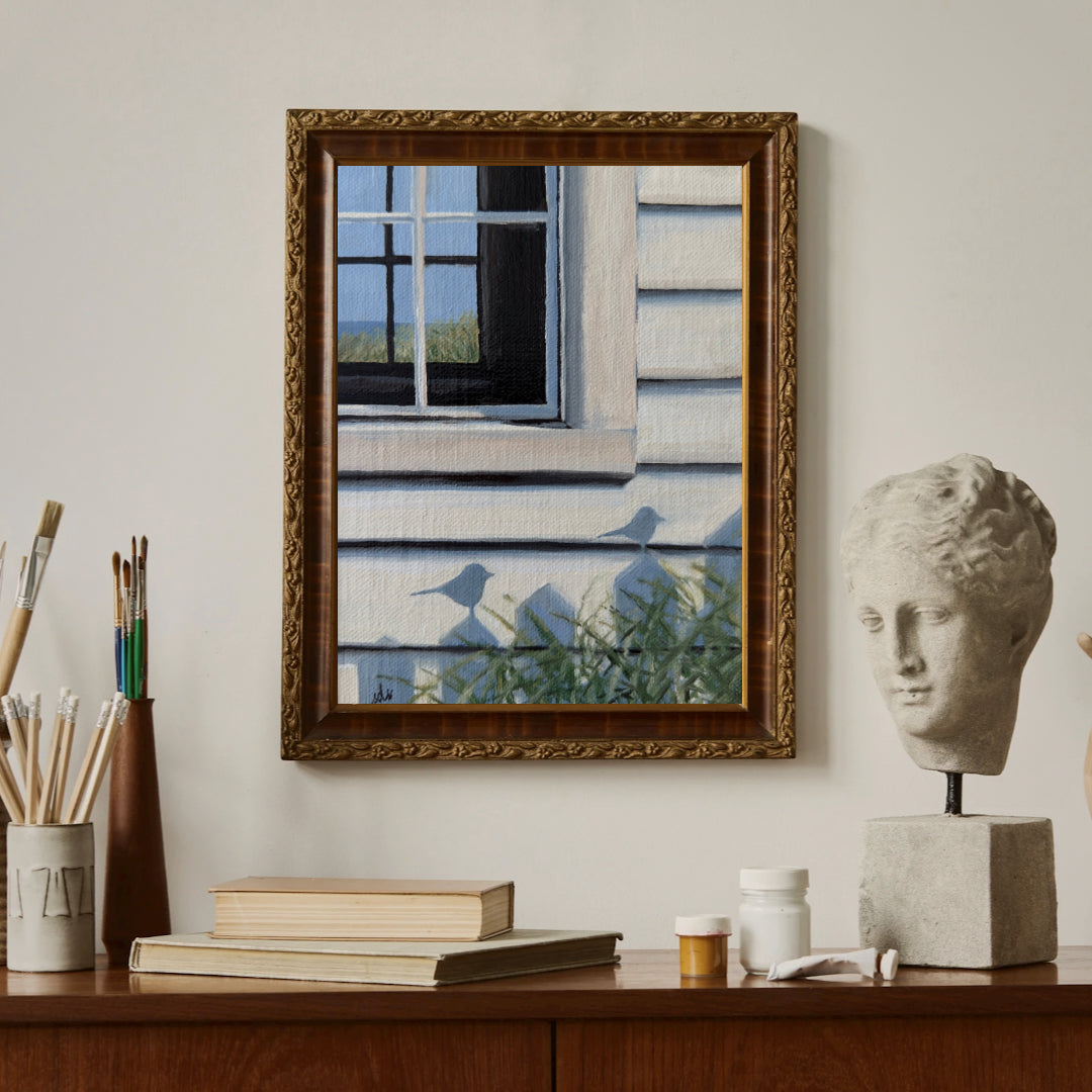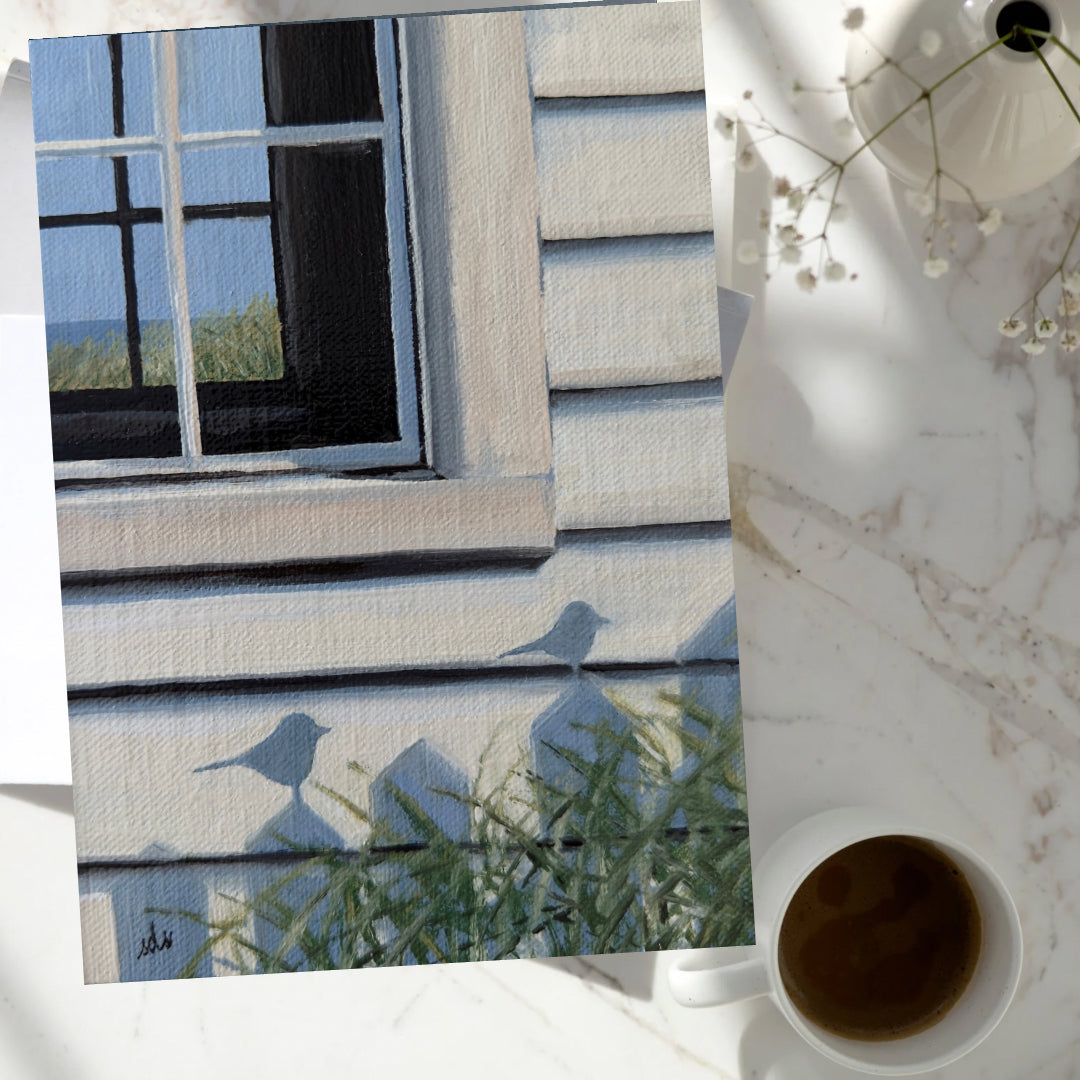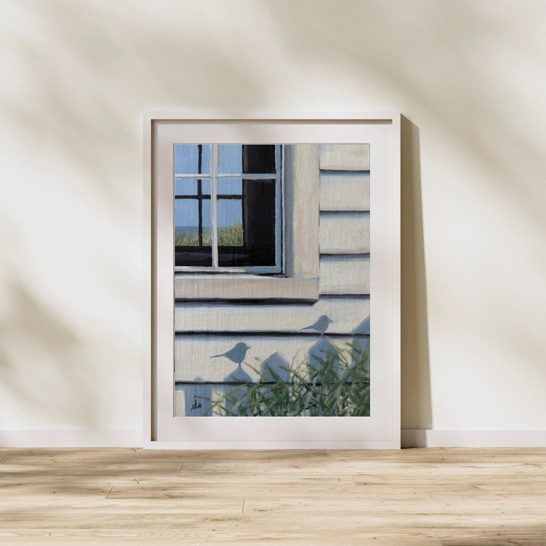 Bird House, captures a fleeting moment of coastal quiet—the play of shadows across sunlit siding, grasses swaying below, and a glimpse of sea and sky through the window beyond. It’s a piece that celebrates subtle beauty, where light, place, and memory converge to remind us of the poetry in everyday details. Gentle and contemplative, it invites the viewer to pause and see the world a little more closely.